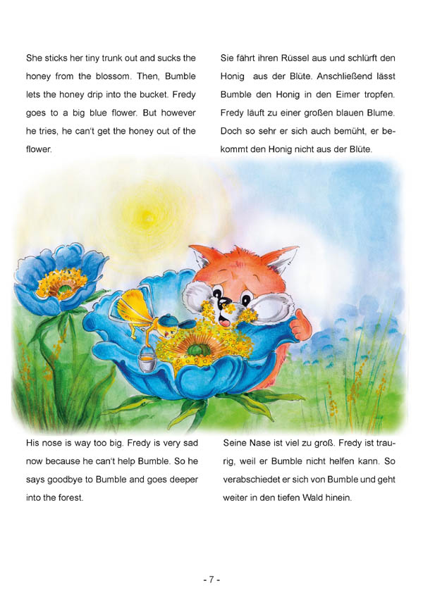 In unserer ersten Kindergeschichte wandert Fredy, der kleine Fuchs in den großen Wald auf der Suche nach Freunden. Er trifft Bumble, die Biene und will ihr beim Honig sammeln helfen. Aber warum kann er nicht helfen? Was ist passiert? Warum zeigt ihm Colin seine gefährlichen Zähne? Wer schnarcht ganz fürchterlich unter der alten Eiche?